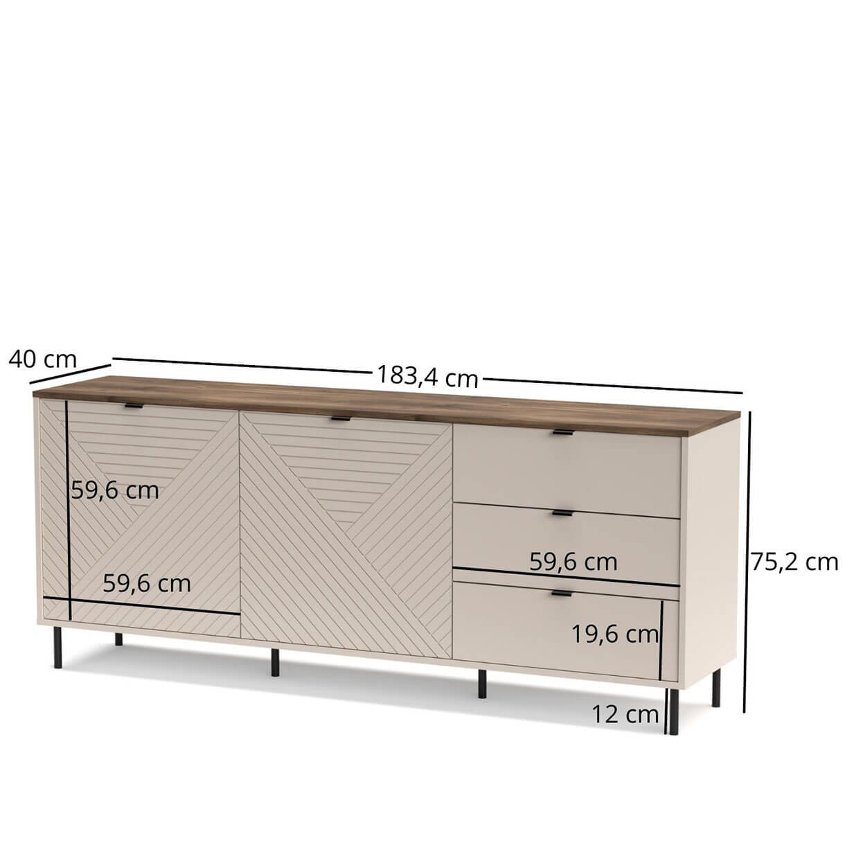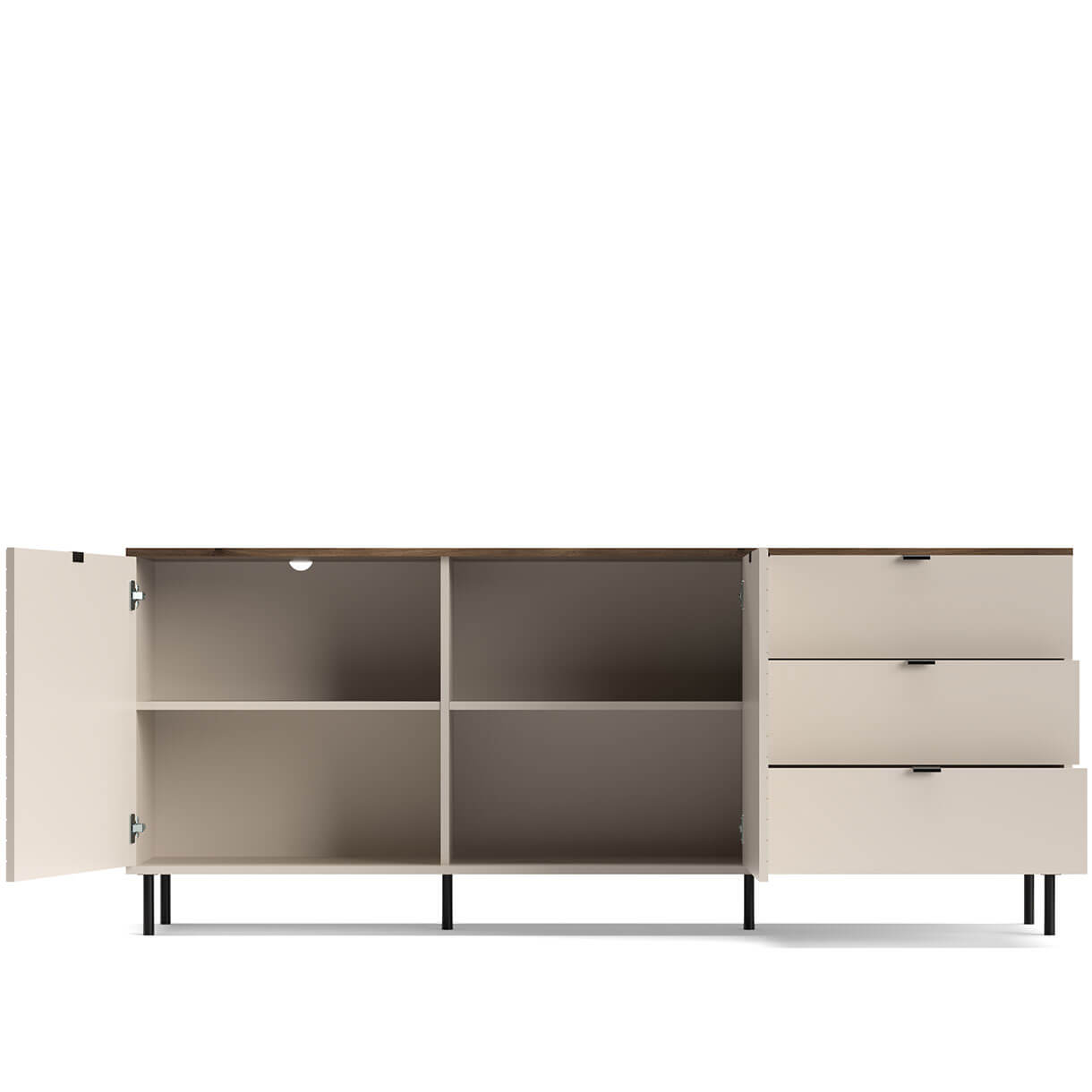 Комод Ево Мебельбос 2D3S містить три шухляди та два закриті відділення з полицею в кожному.