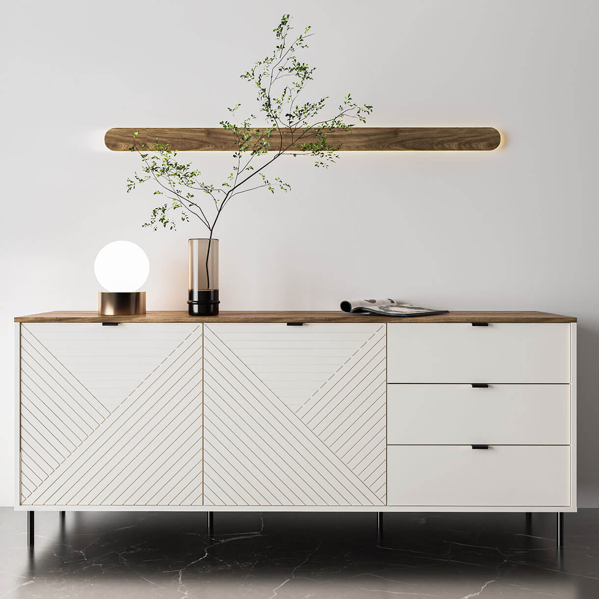 Дверні фасади декоровані фрезеруванням з діагональних і горизонтальних ліній.