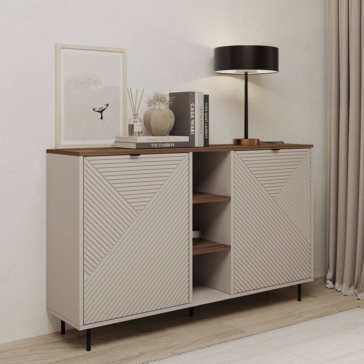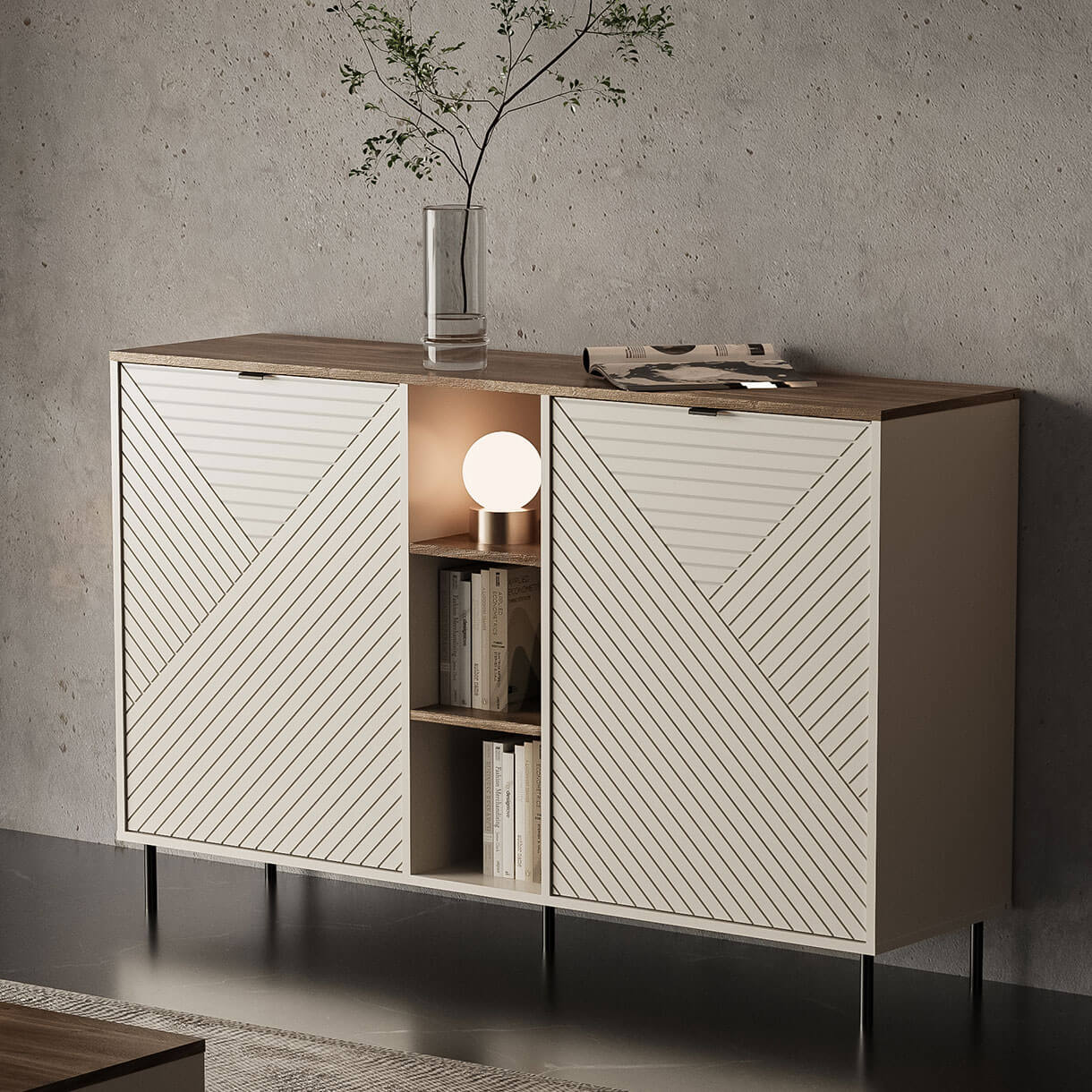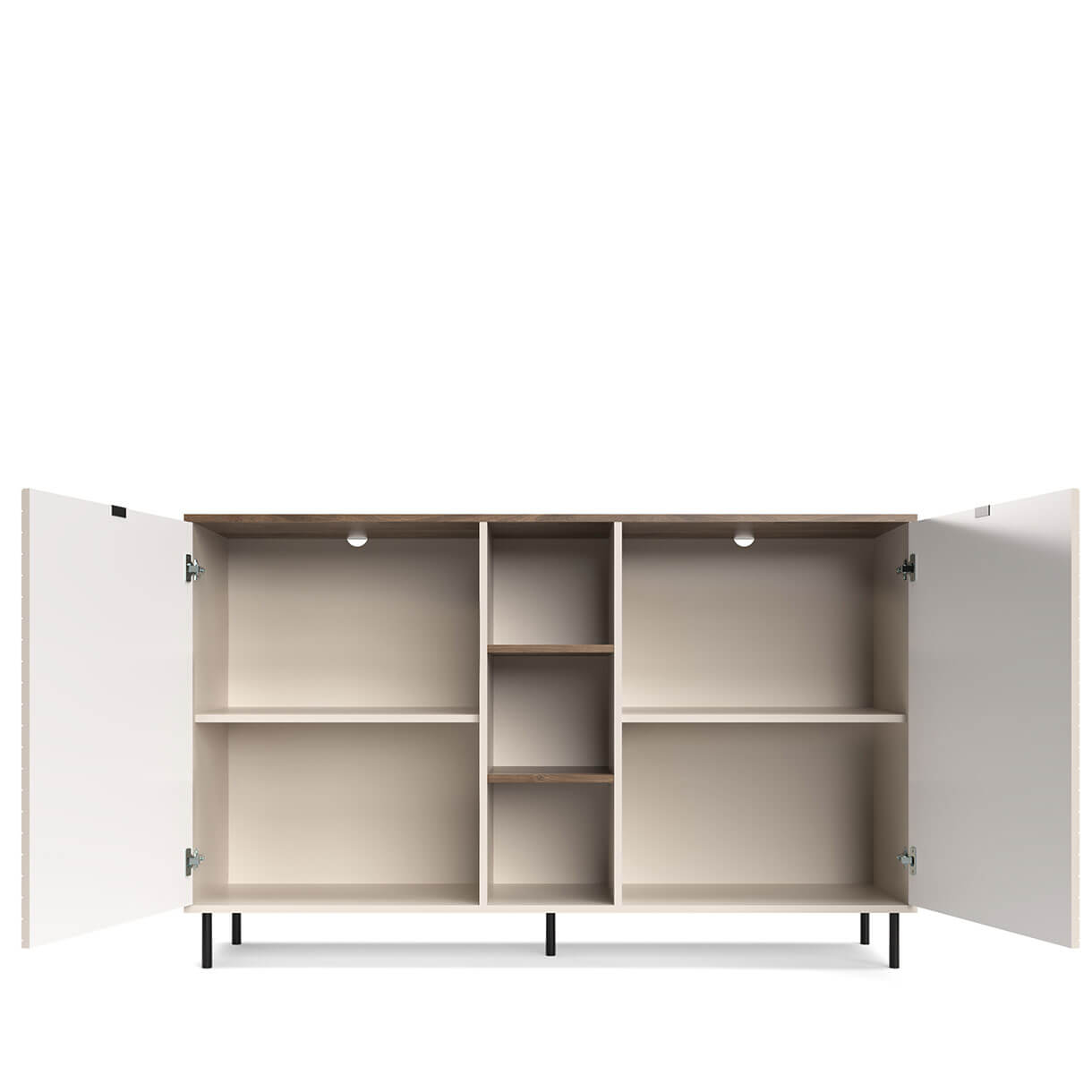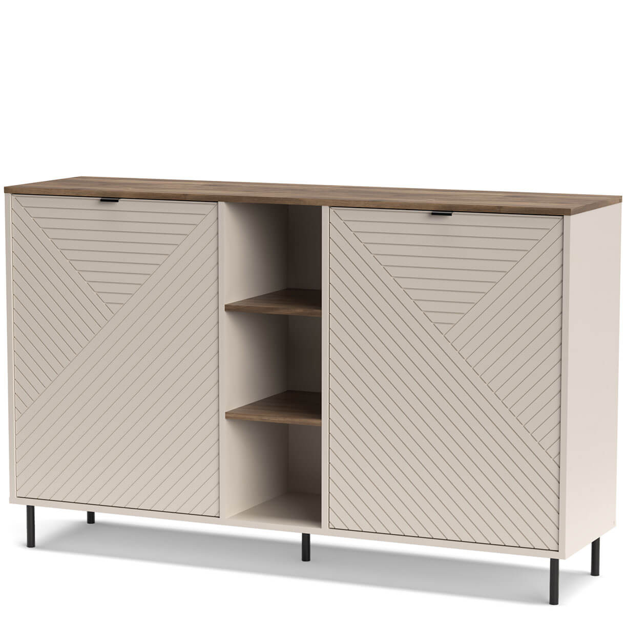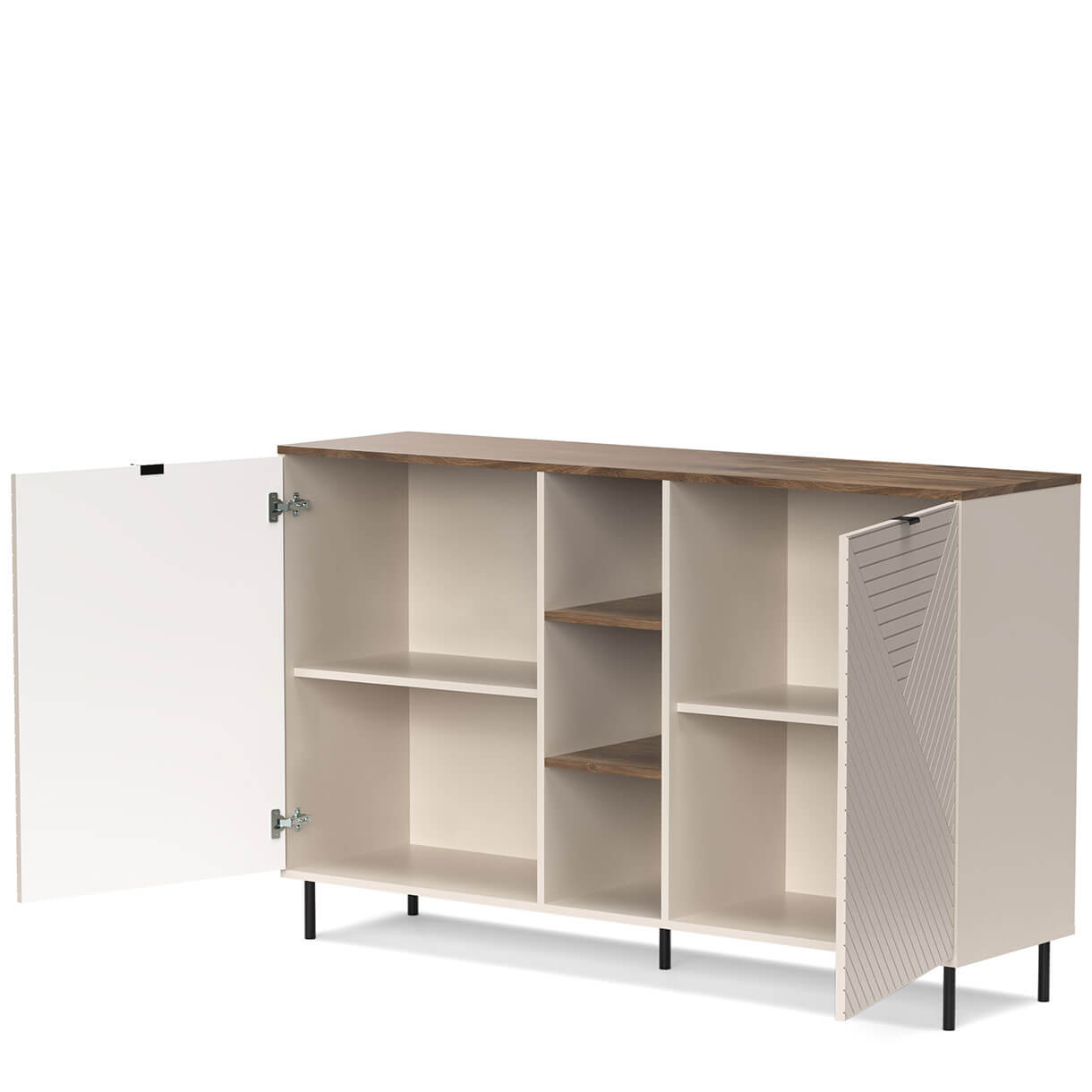 Комод з полицями Ево Мебельбос 2D містить три відкриті та два закриті відділення з полицею в кожному.