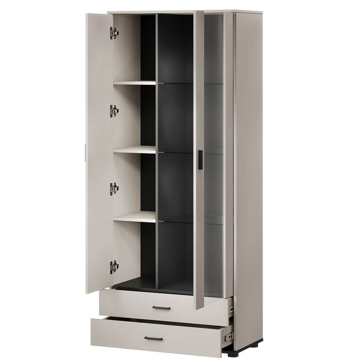 Вітрина 2D2S Сохо Кама S6 містить дві шухляди та два закриті відділення. За дверима зі склом розташовані три скляні полиці, за глухими дверима – три дерев'яні.