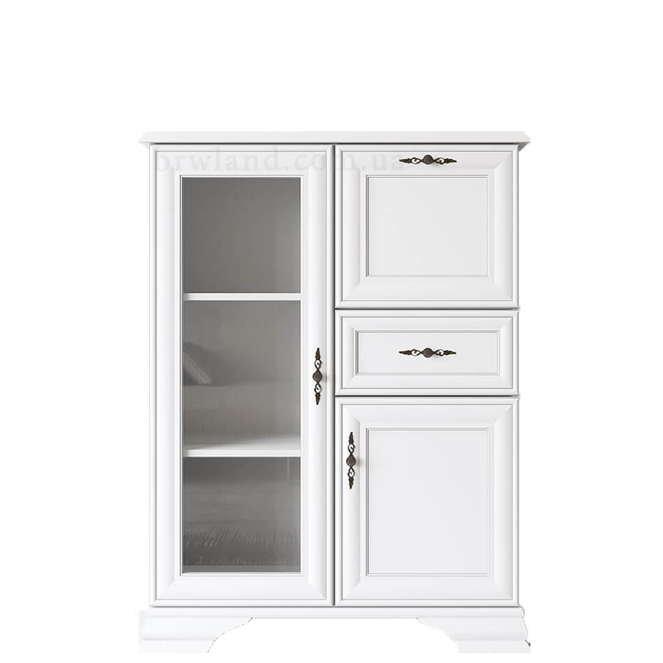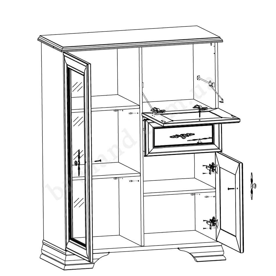 Вітрина-бар Kentuki BRW REG1W1D1S1B містить шухляду та три закриті відділення. За лівими дверима зі скляною вставкою розташовані дві полиці. У правому нижньому відділенні встановлена одна полиця. За відкидними дверима знаходиться просторе барне відділення.