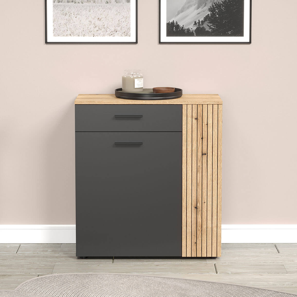 Тумба Естебан Мебельбос 2D1S містить шухляду та закрите двома дверима відділення з полицею всередині.