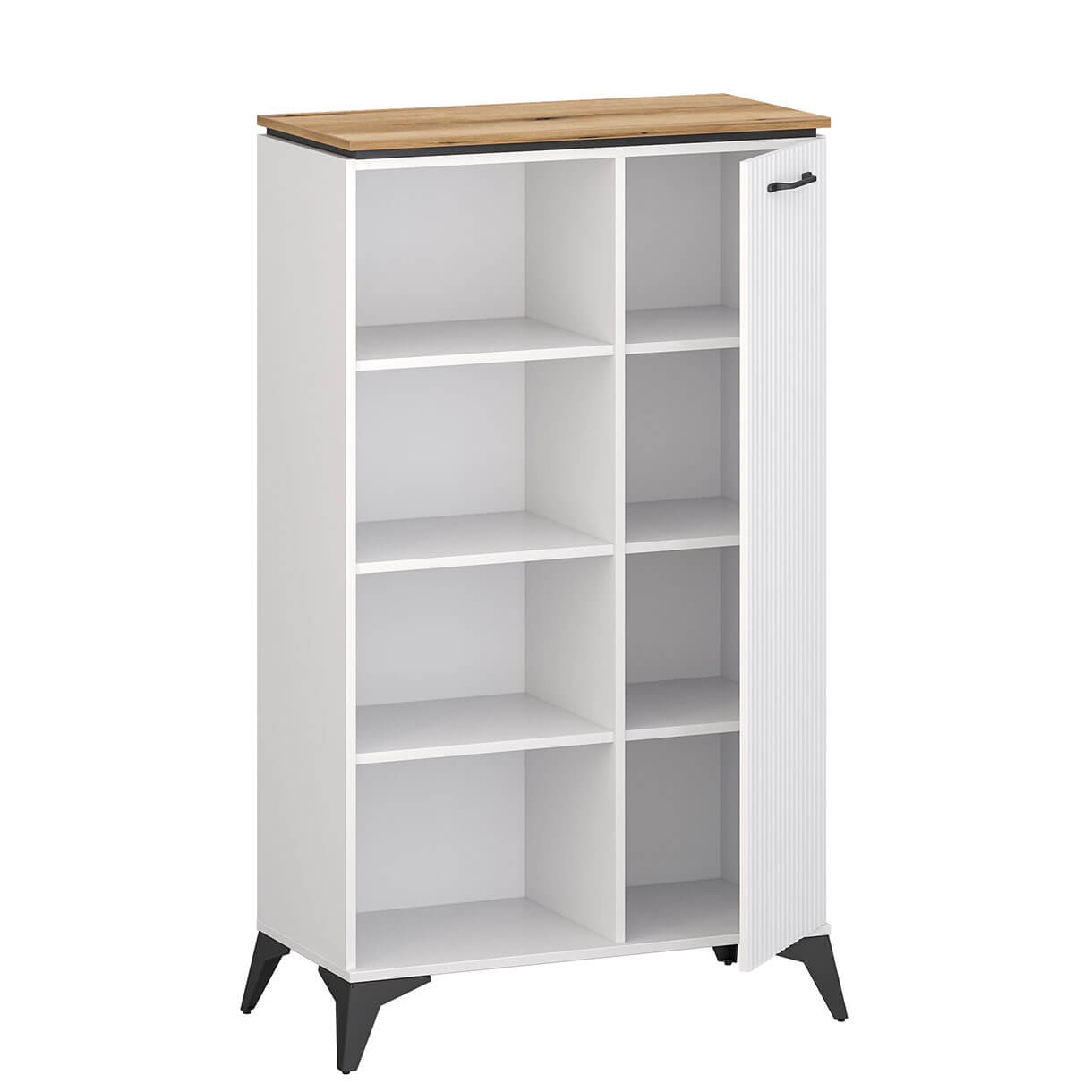 Стелаж Велутто Мебельбос 1D містить чотири ніші та одне закрите відділення з трьома полицями всередині.