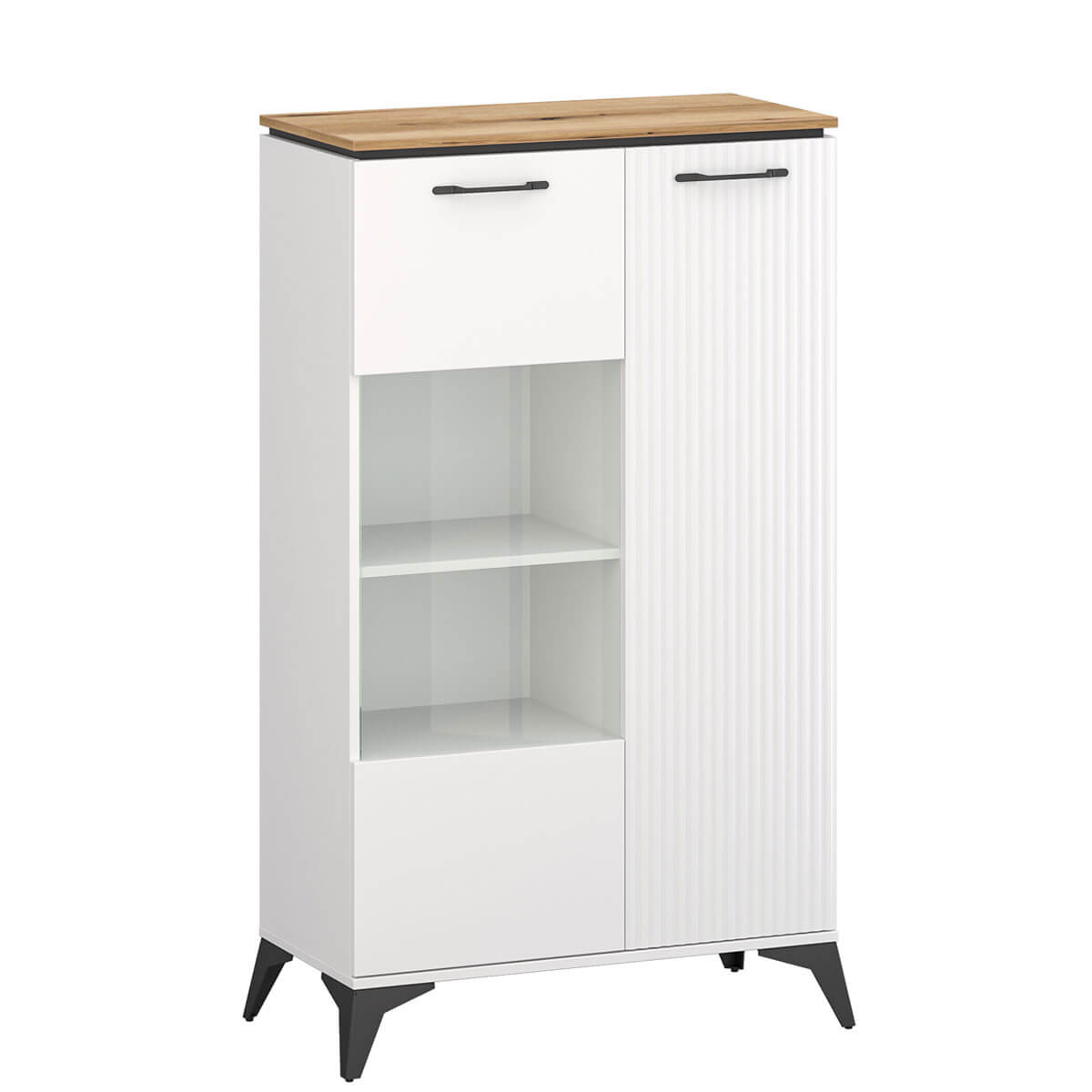 Низька вітрина Велутто Мебельбос 1D1W містить два закриті відділення з трьома полицями в кожному. Ліві двері оснащені прозорою скляною вставкою.