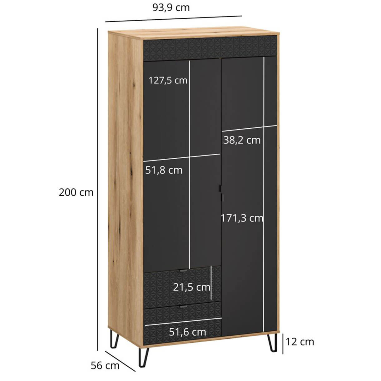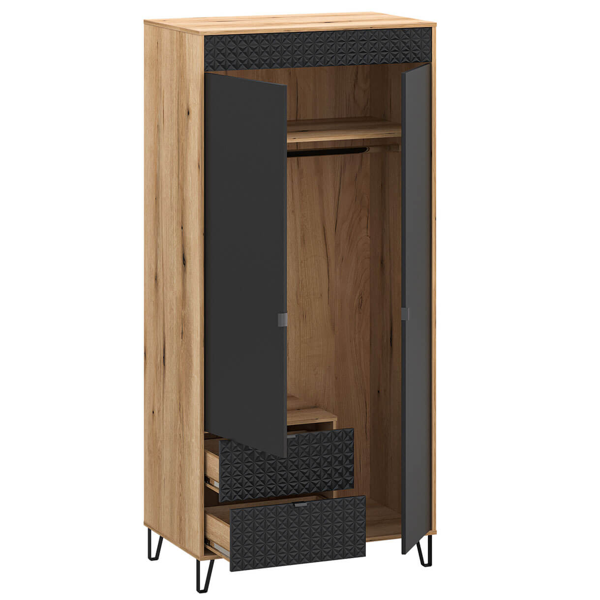 Шафа Беллано Мебельбос 2D2S містить дві шухляди та одне закрите відділення з полицею та штангою для вішалок усередині.