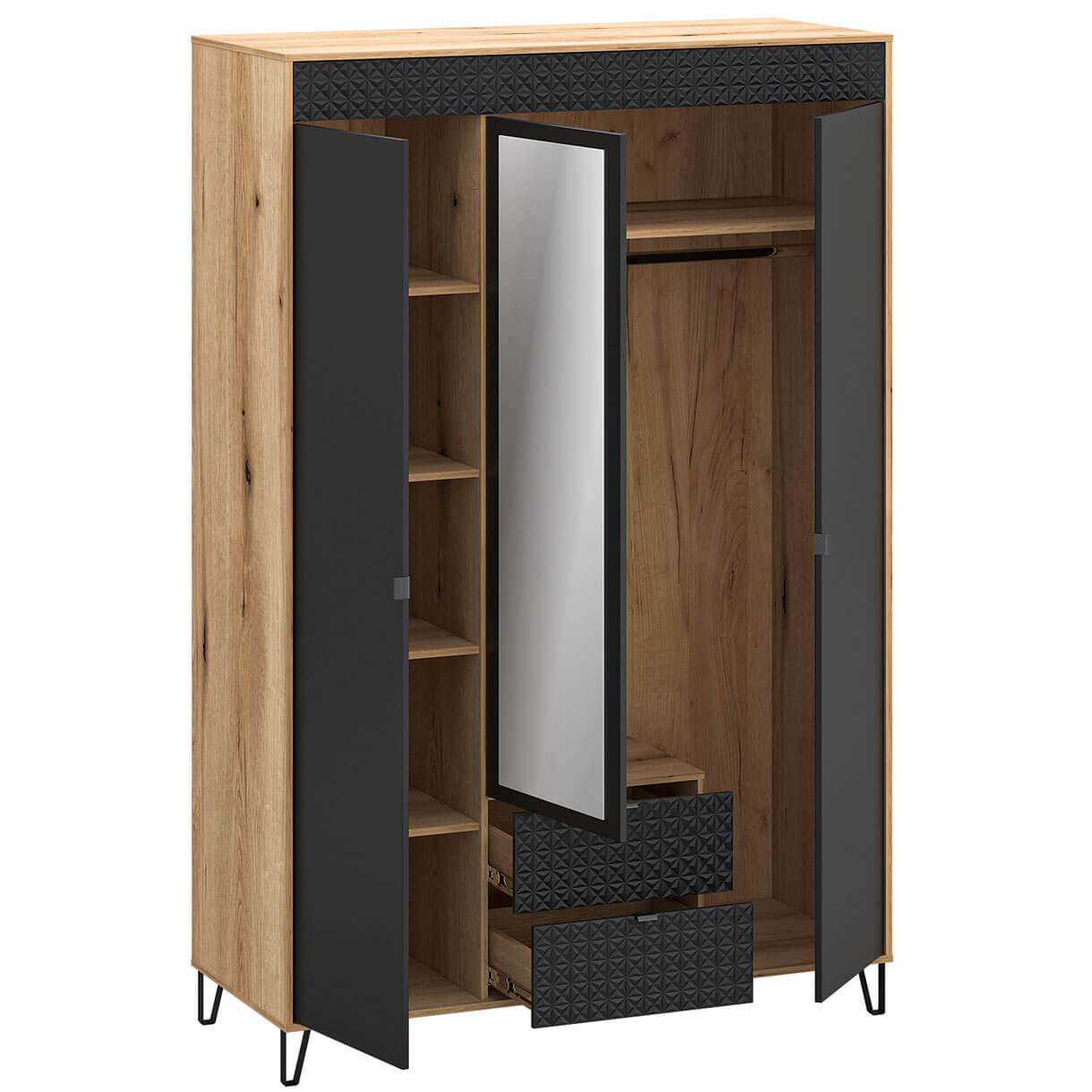Шафа Беллано Мебельбос 3D2S містить дві шухляди та два закриті відділення. Зліва встановлено чотири полиці, праворуч – полиця та штанга для вішалок.