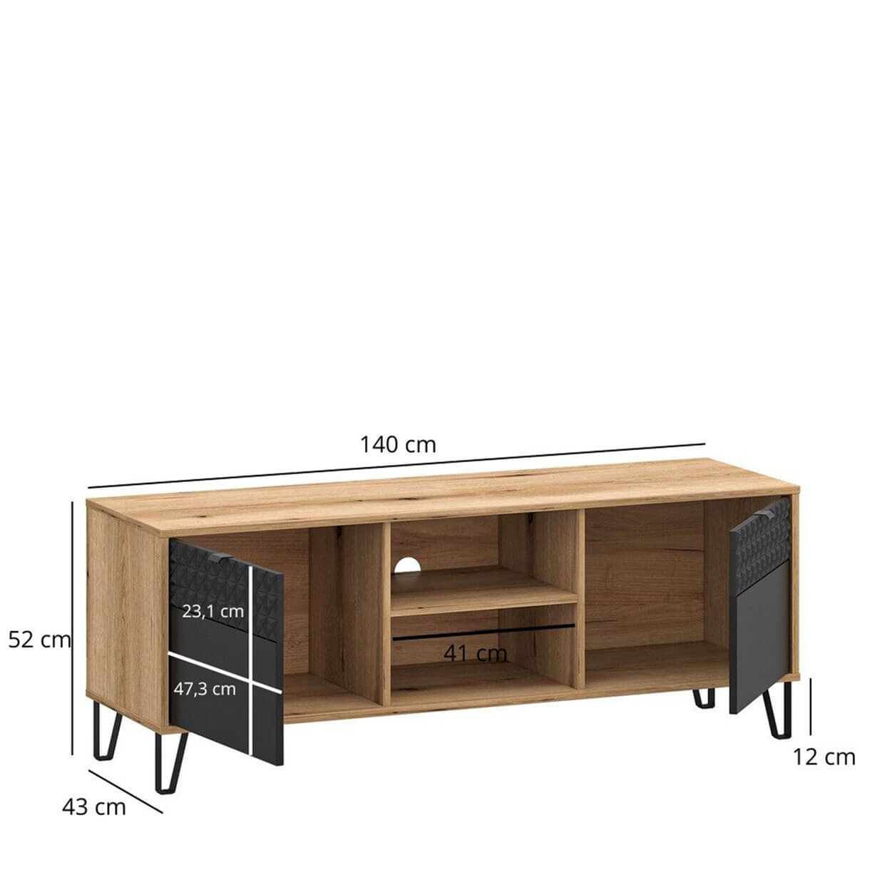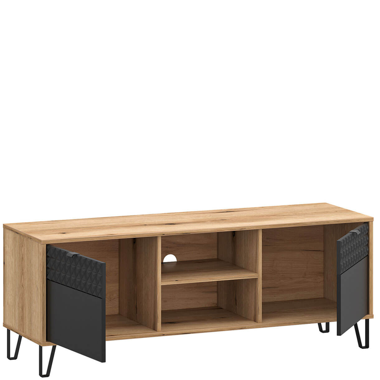Телевізійна тумба Беллано Мебельбос 2D містить два закритих відділення та дві ніші з технічним отвором для проводів у задній стінці.