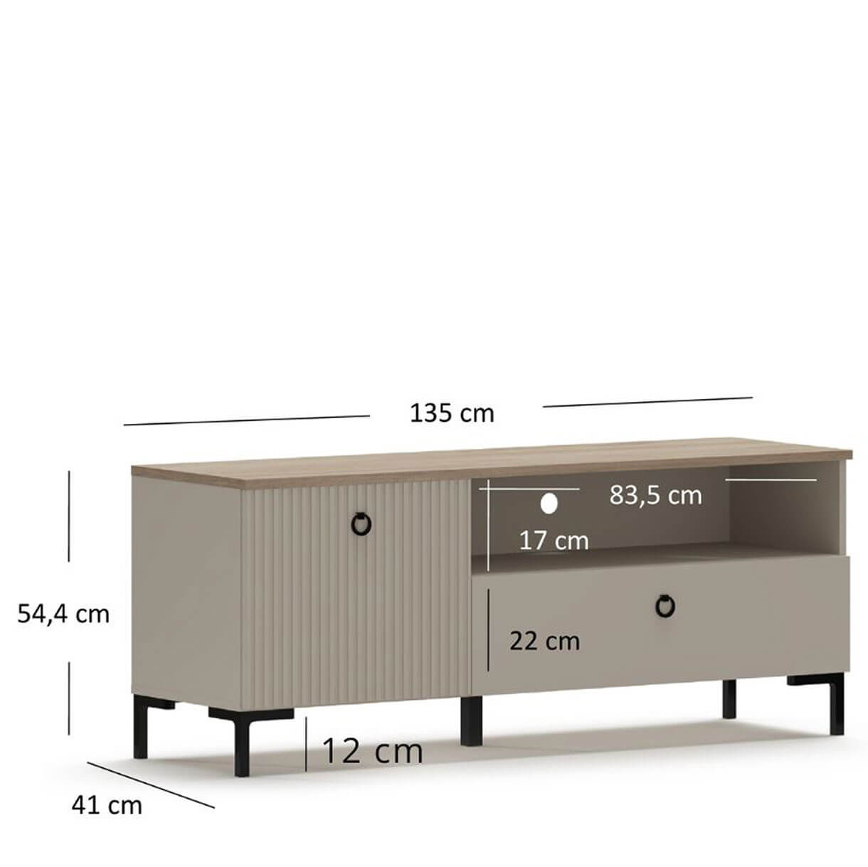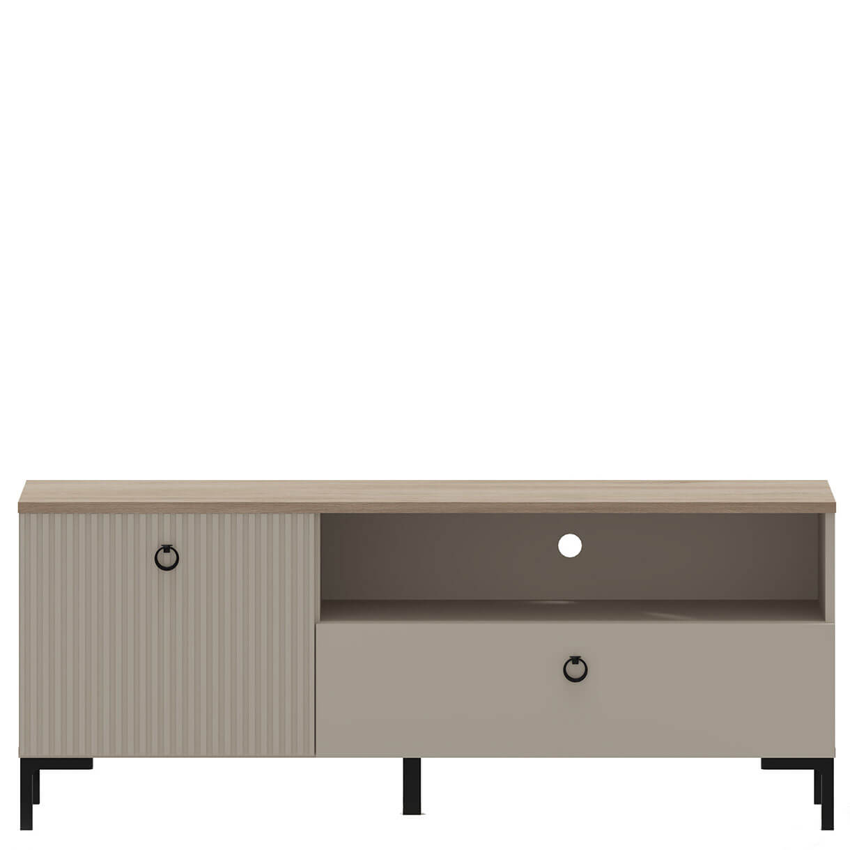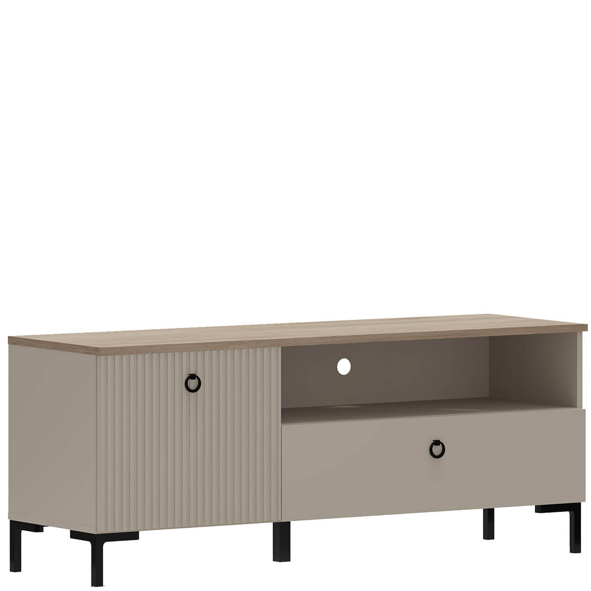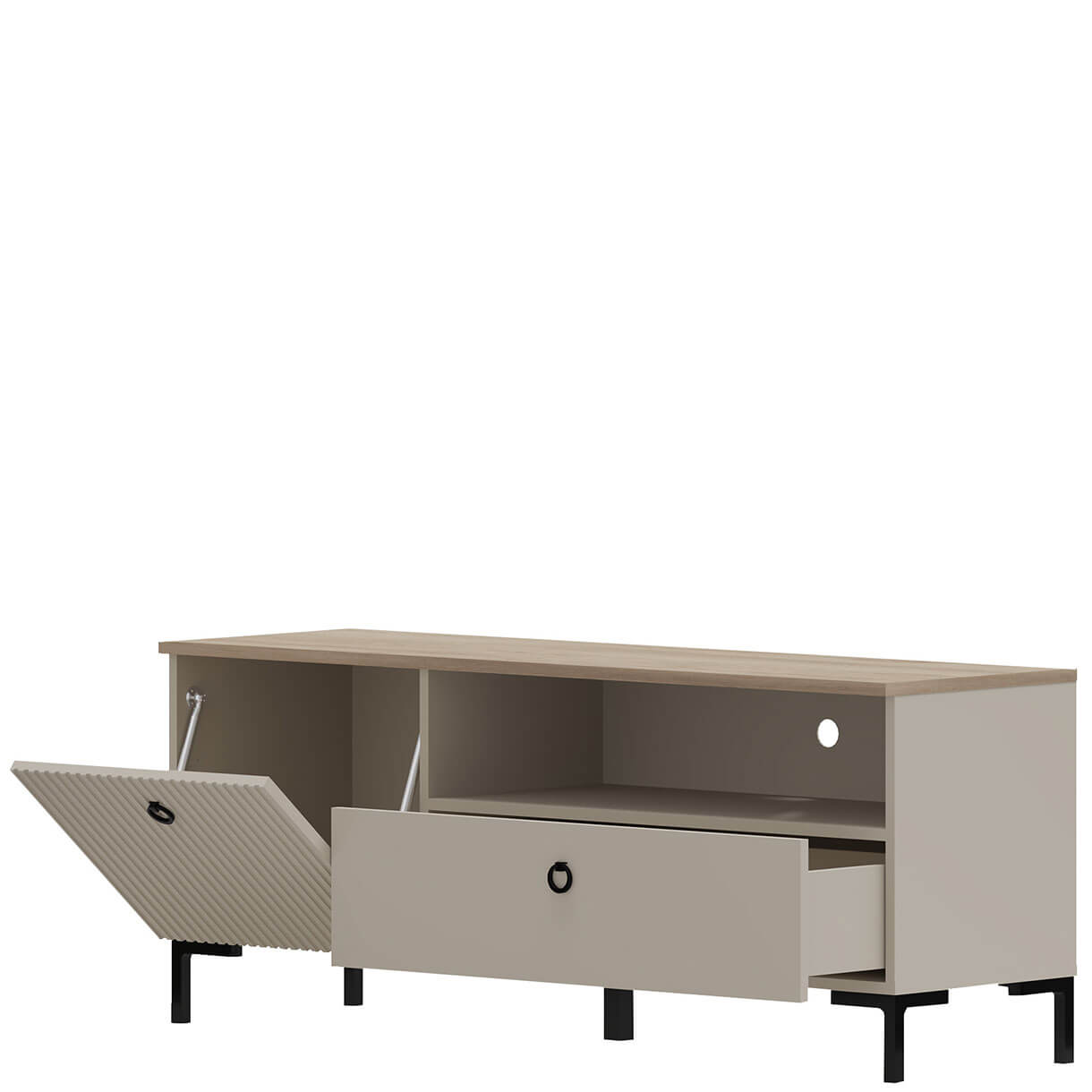 Тумба ТВ Домініка Мебельбос 1K1S містить шухляду, закрите відділення з відкидними дверима та нішу з технічним отвором для проводів у задній стінці.