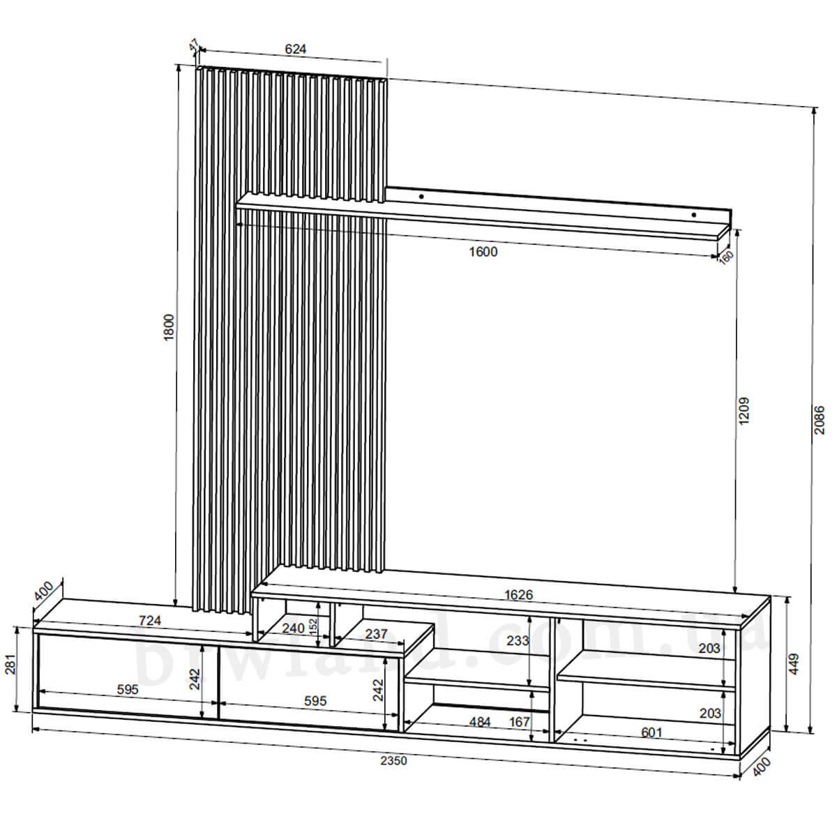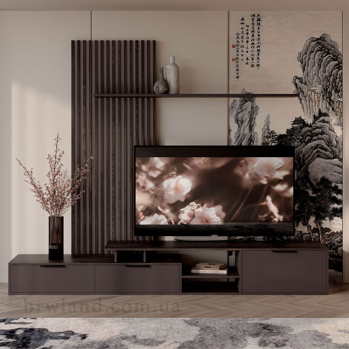 Комплект меблів для вітальні Elior BRW складається з тумби під телевізор із надставкою, панелі з дерев'яними рейками та настінної полиці.