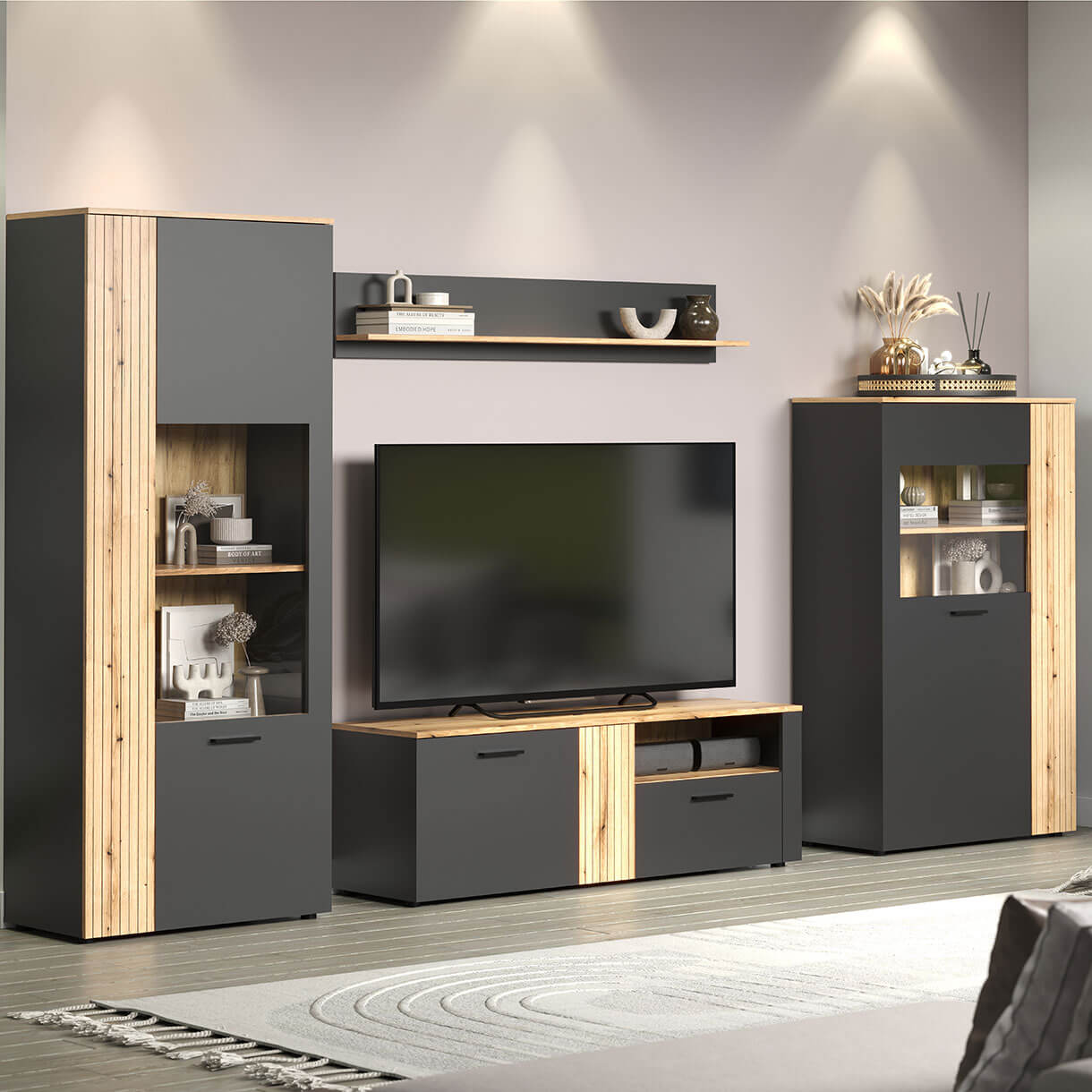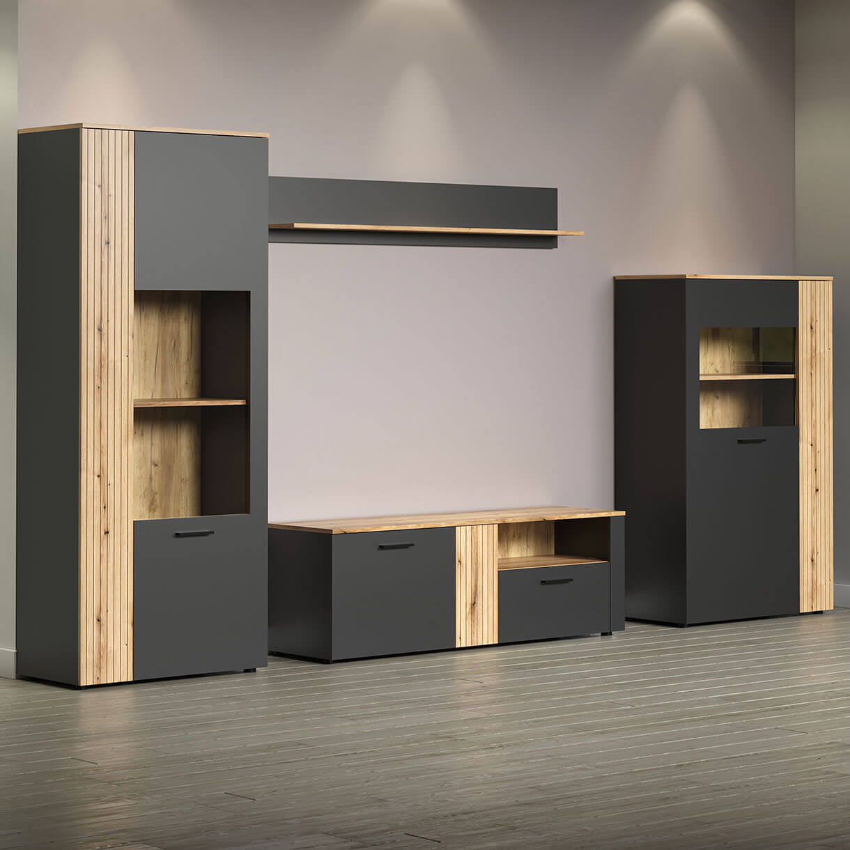 Вітрини зі вставками із прозорого загартованого скла та тумба ТВ за додаткову плату комплектуються підсвіткою LED Stik теплого білого кольору.