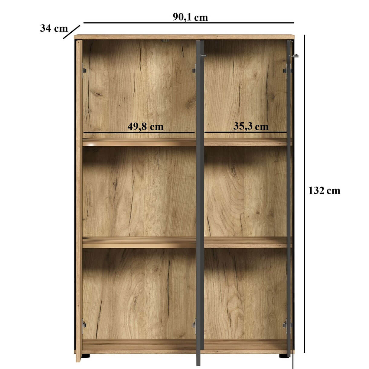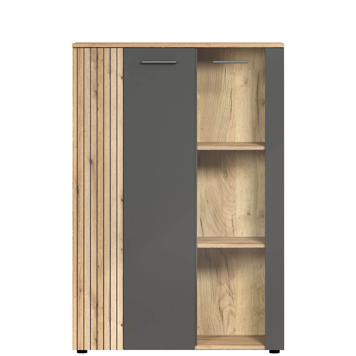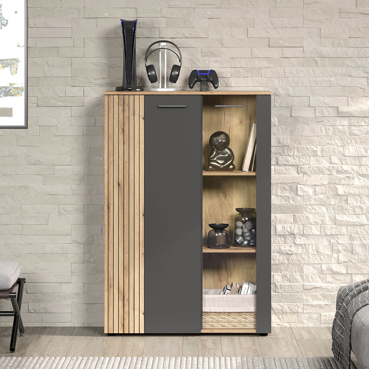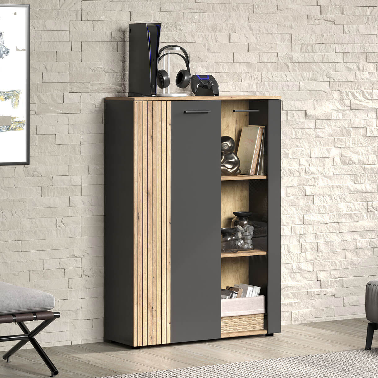 Низька вітрина Естебан Мебельбос 2D1W містить два закриті відділення з двома дерев'яними полицями в кожному.