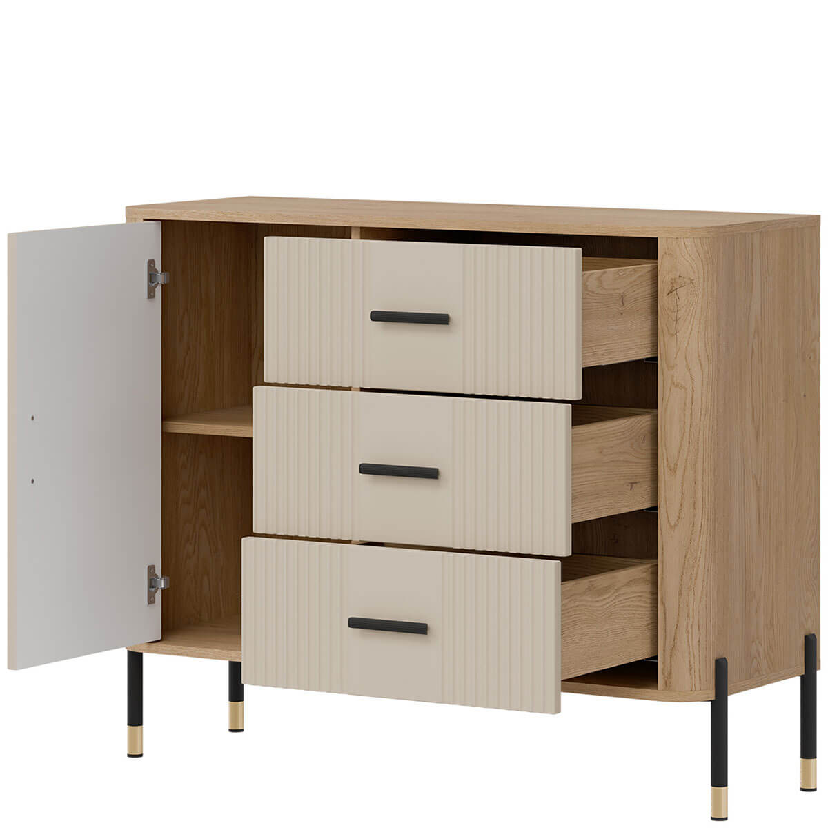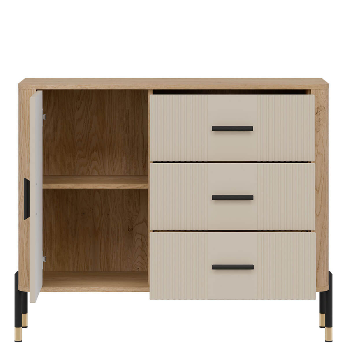 Комод Данте Лівео DT03 містить три шухляди та закрите відділення з полицею всередині.