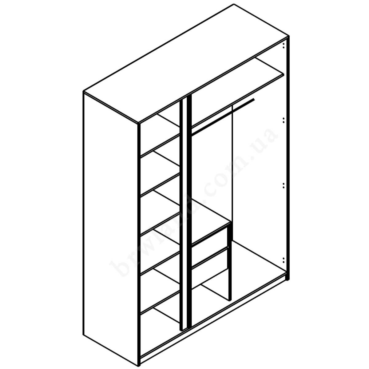 Шафа Luca Gerbor SZF3D2S містить два закриті відділення. За лівими дверима знаходяться п'ять полиць. Праворуч за двома дверима розташовані дві шухляди з полицею над ними, штанга для вішалок та полиця на всю ширину.
