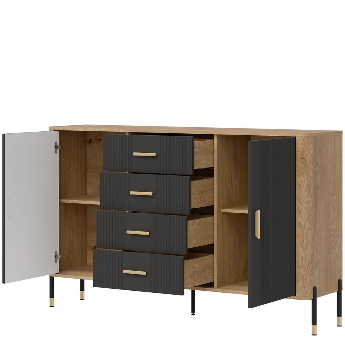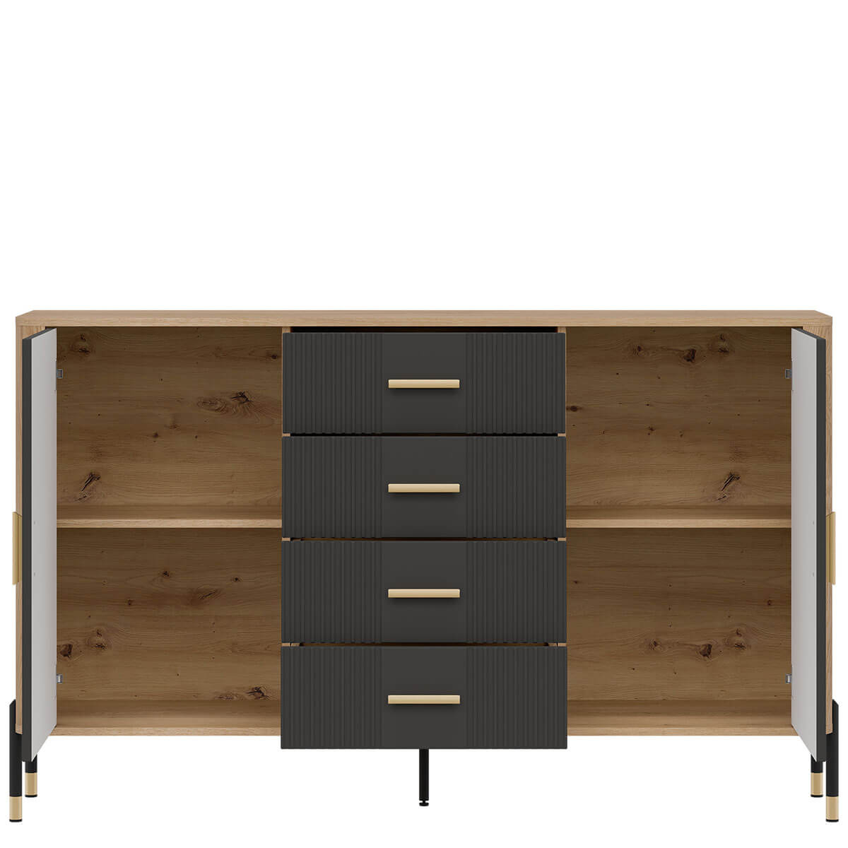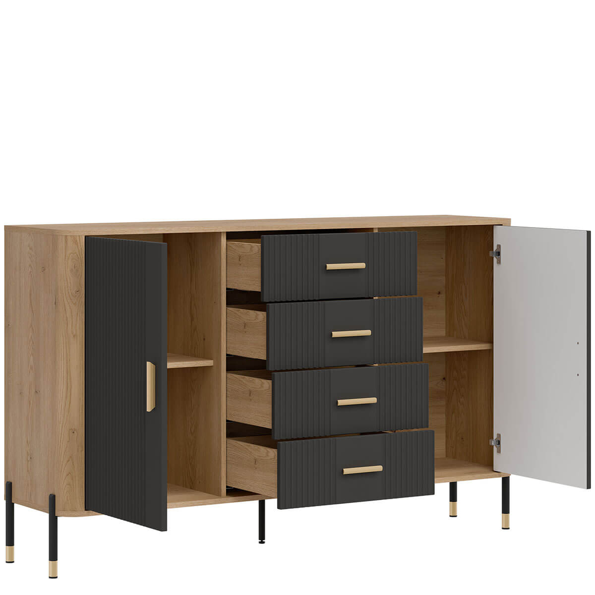 Комод Данте Лівео DT09 містить чотири шухляди та два закриті відділення з полицею в кожному.
