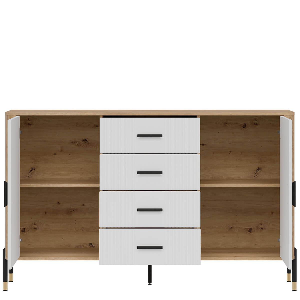 Комод Данте Лівео DT09 містить чотири шухляди та два закриті відділення з полицею в кожному.