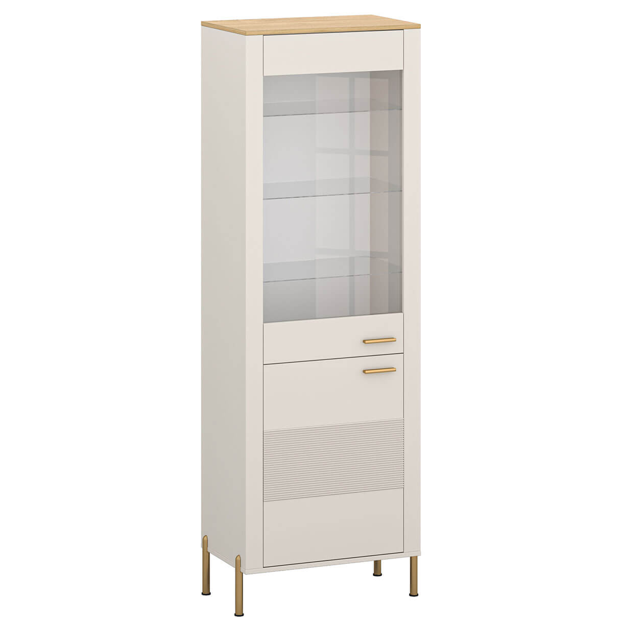 Вітрина Рубен Мебельбос 1D1W містить два закритих відділення. За верхніми дверима зі прозорою скляною вставкою розташовані три скляні полиці, які за додаткову плату можна обладнати підсвіткою 3xLED теплого білого кольору. В нижньому відділенні встановлена одна полиця.