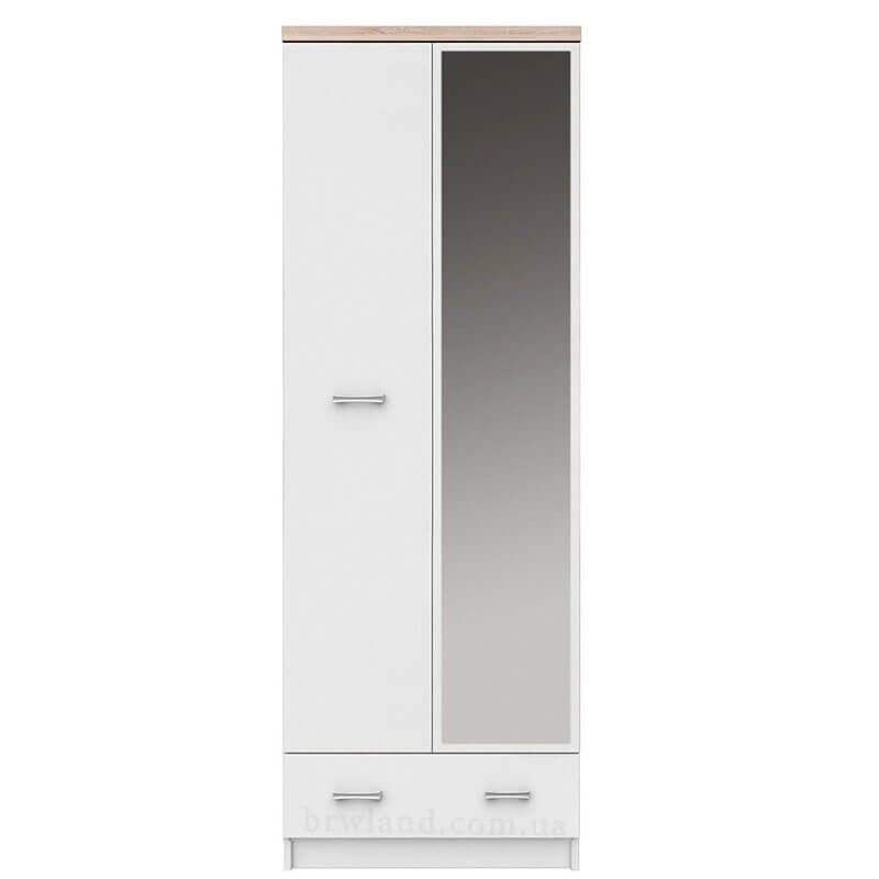 Шафа SZF 2D1S_60 Top Mix VMV містить шухляду та закрите відділення з висувним тремпелем для вішалок. На правому фасаді встановлено дзеркало.