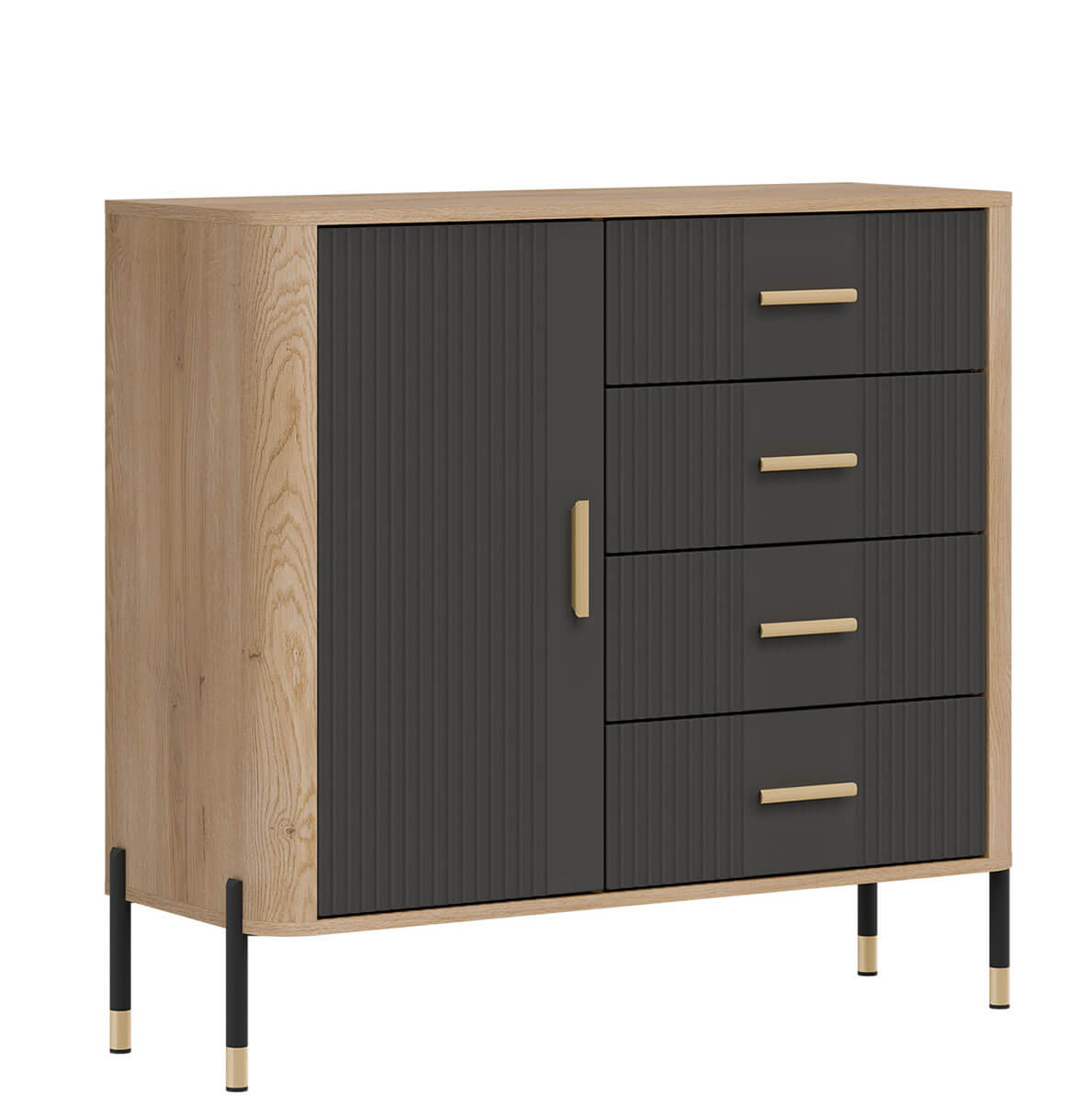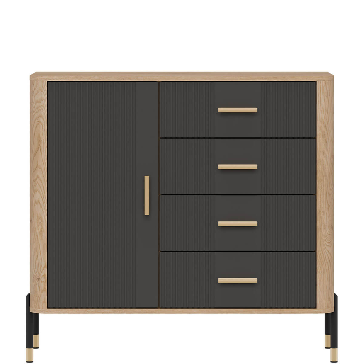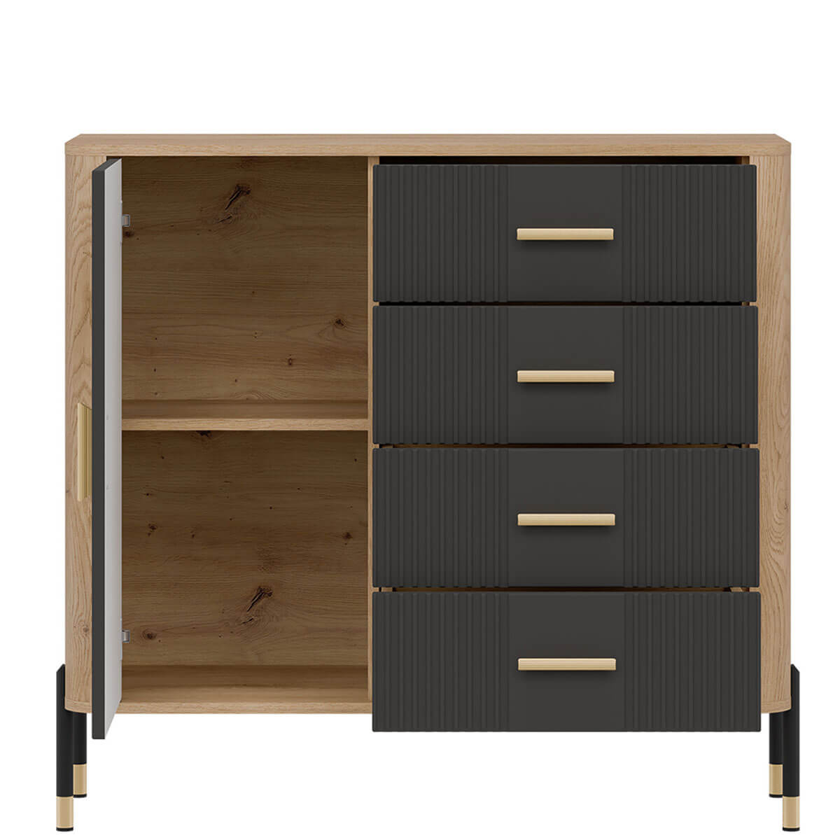 Комод Данте Лівео DT08 містить чотири шухляди та закрите відділення з полицею всередині.