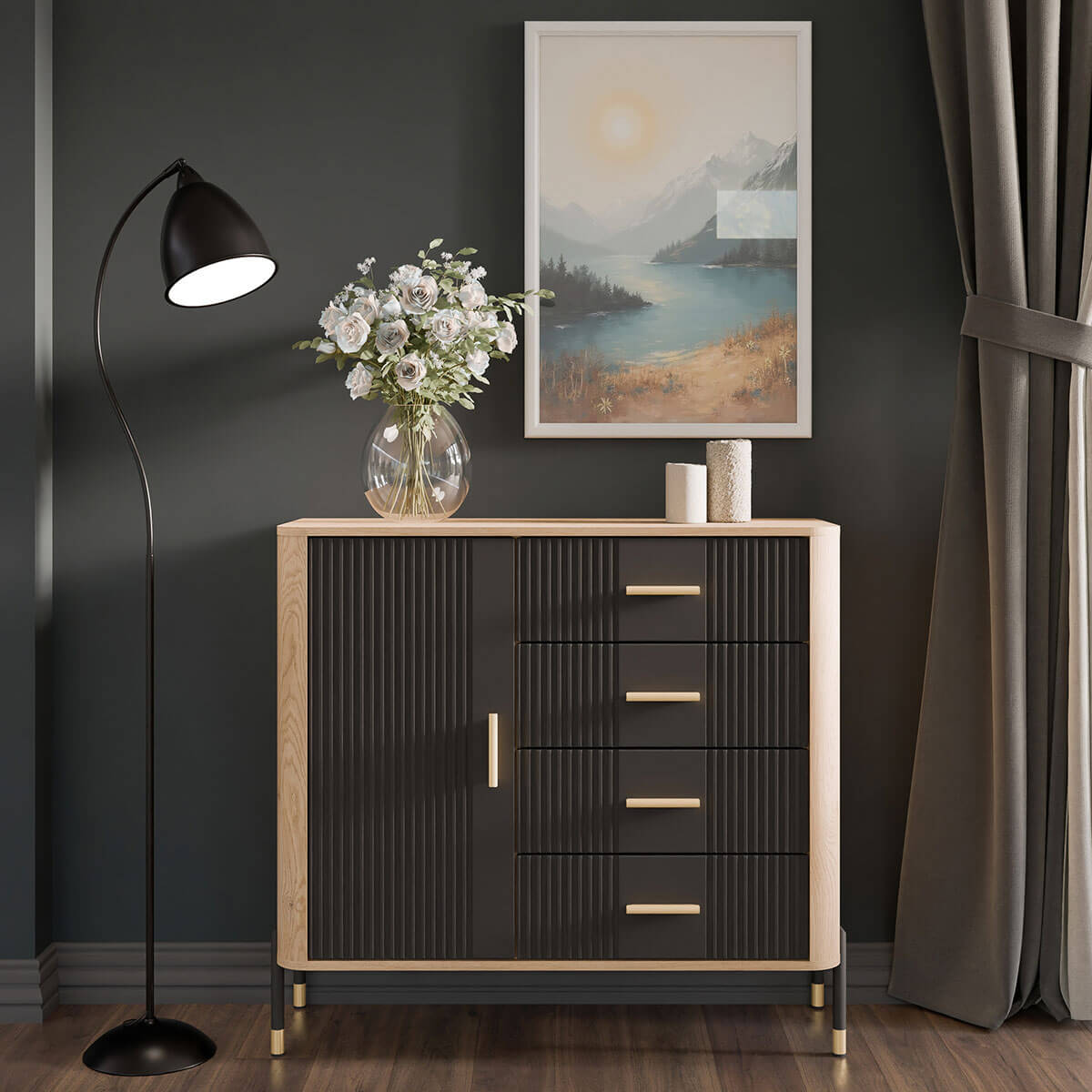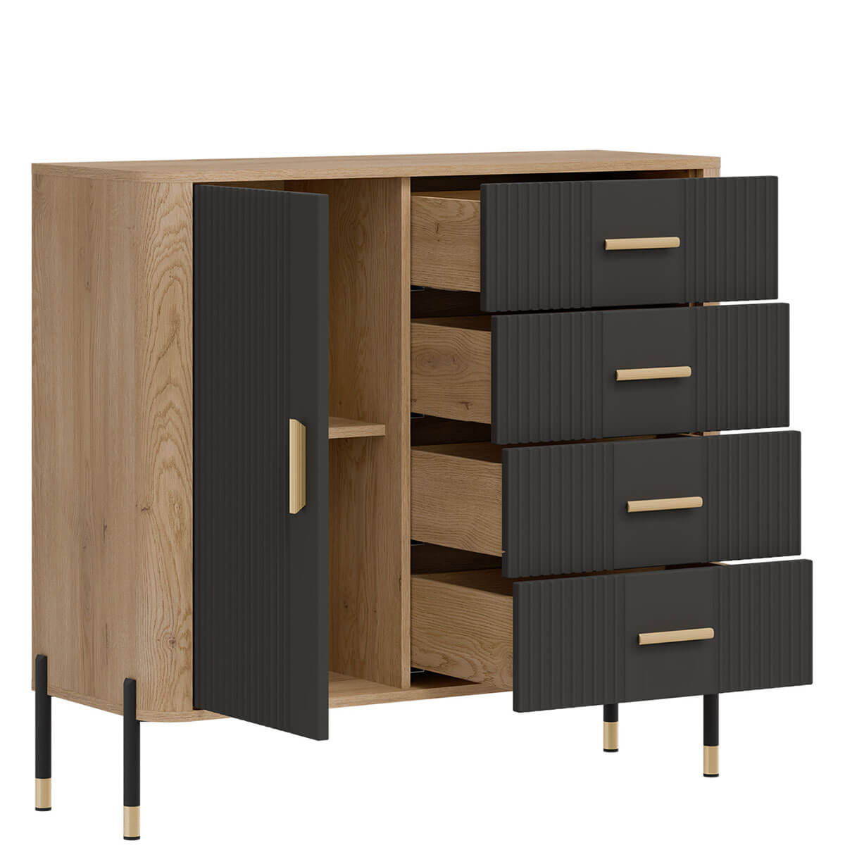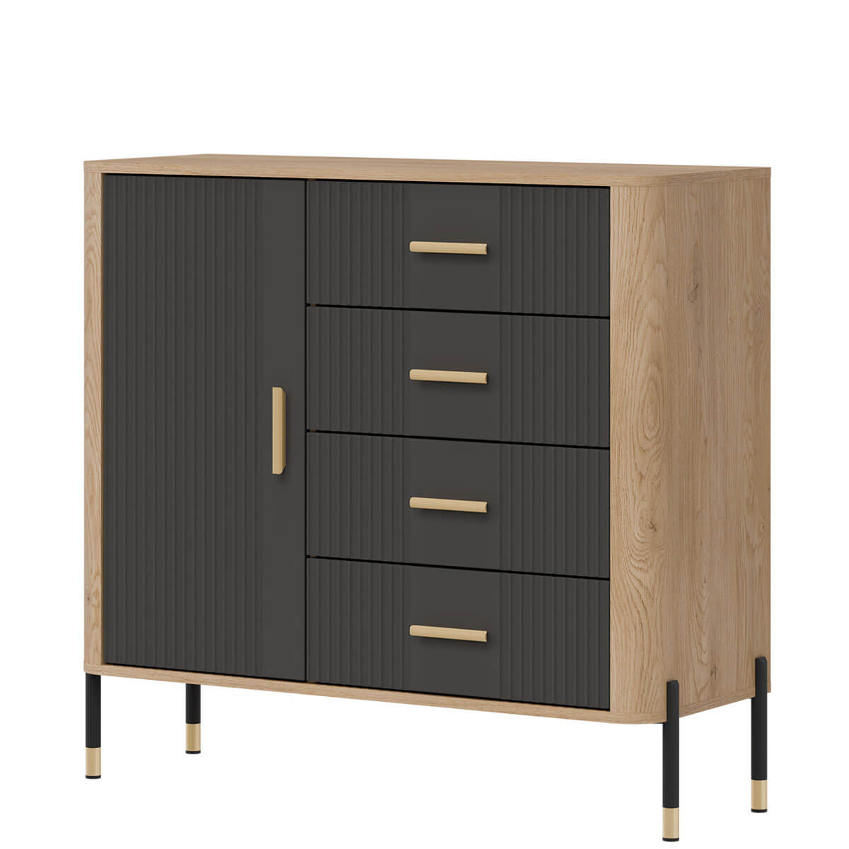 Комод Данте Лівео DT08 містить чотири шухляди та закрите відділення з полицею всередині.