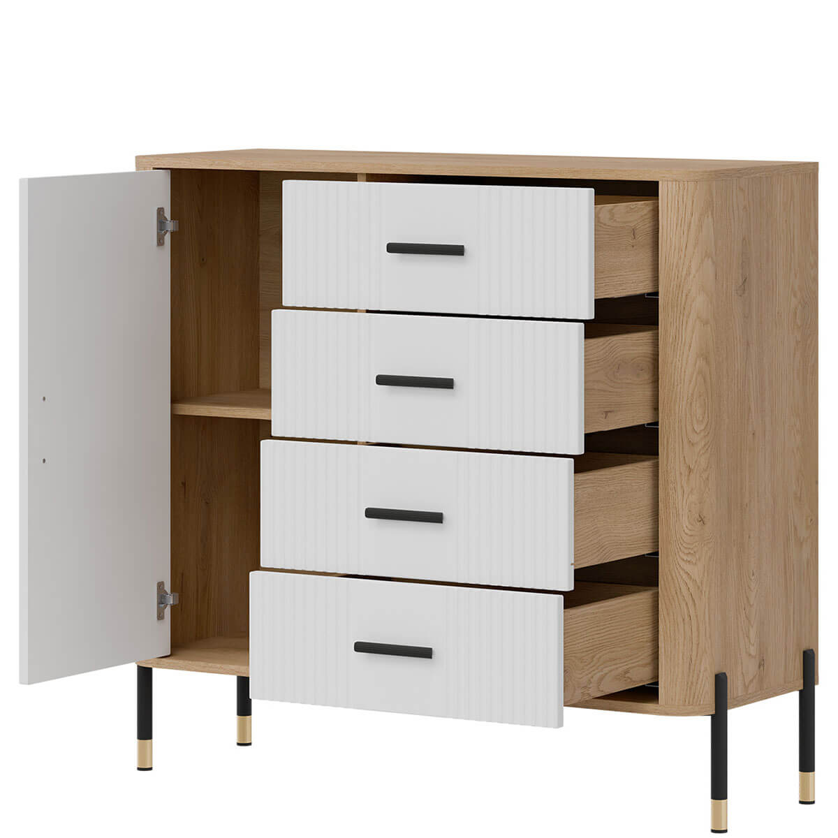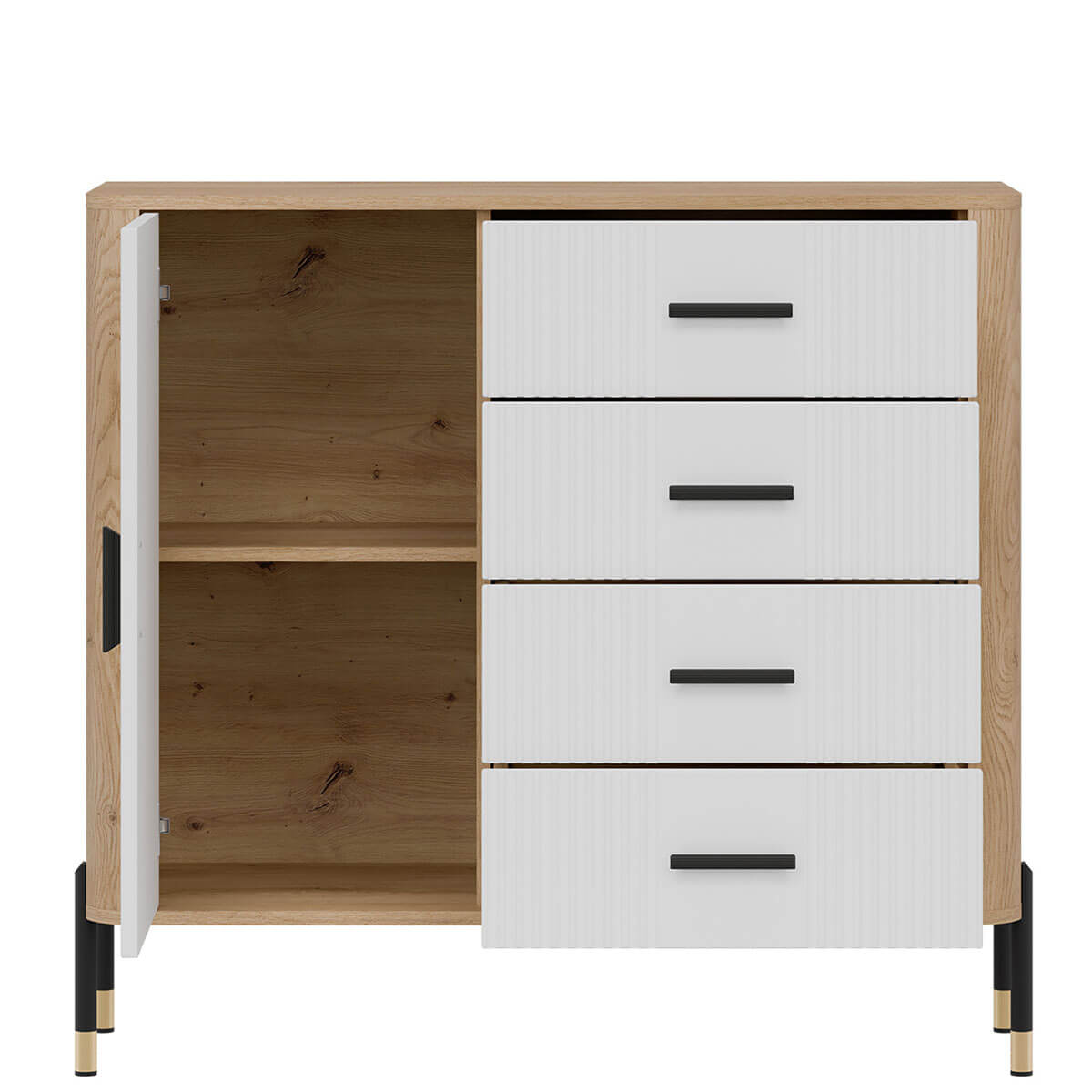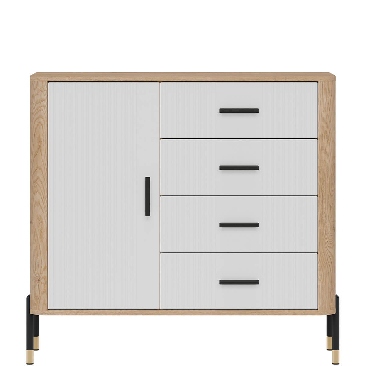 Комод Данте Лівео DT08 містить чотири шухляди та закрите відділення з полицею всередині.