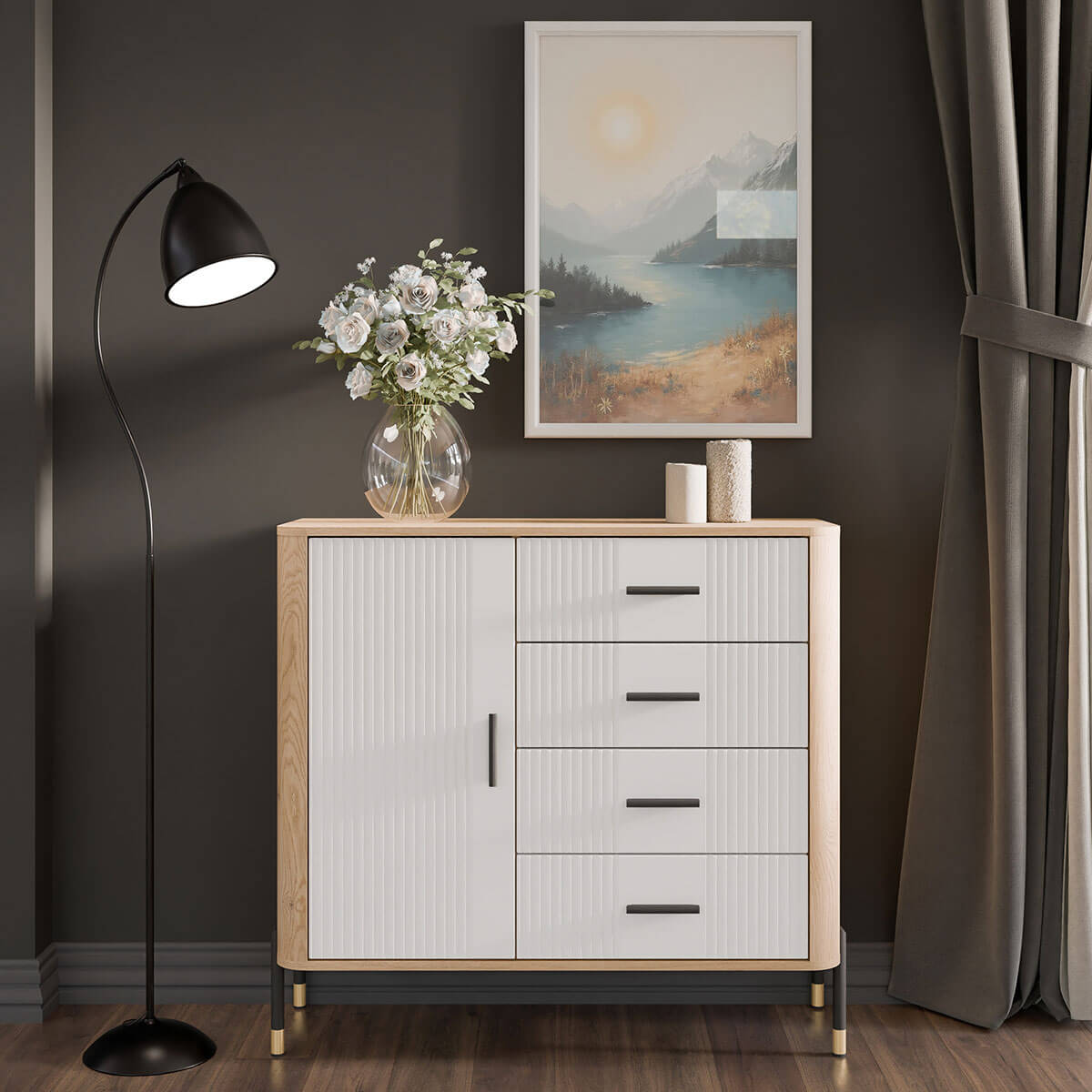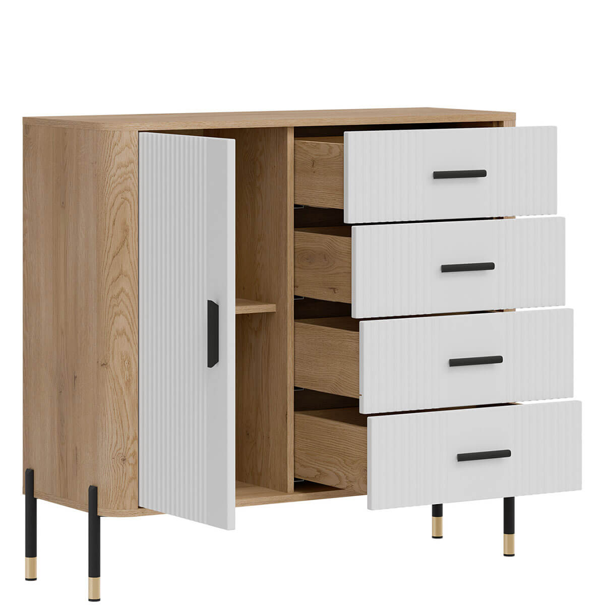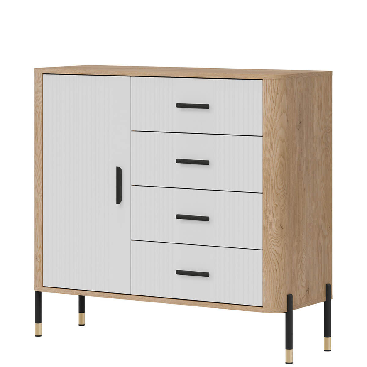 Комод Данте Лівео DT08 містить чотири шухляди та закрите відділення з полицею всередині.