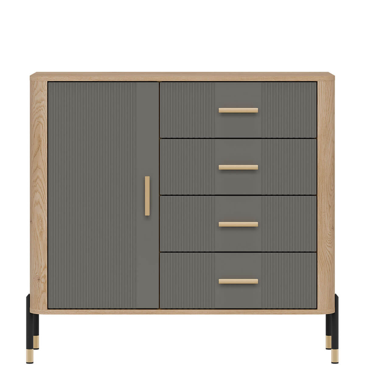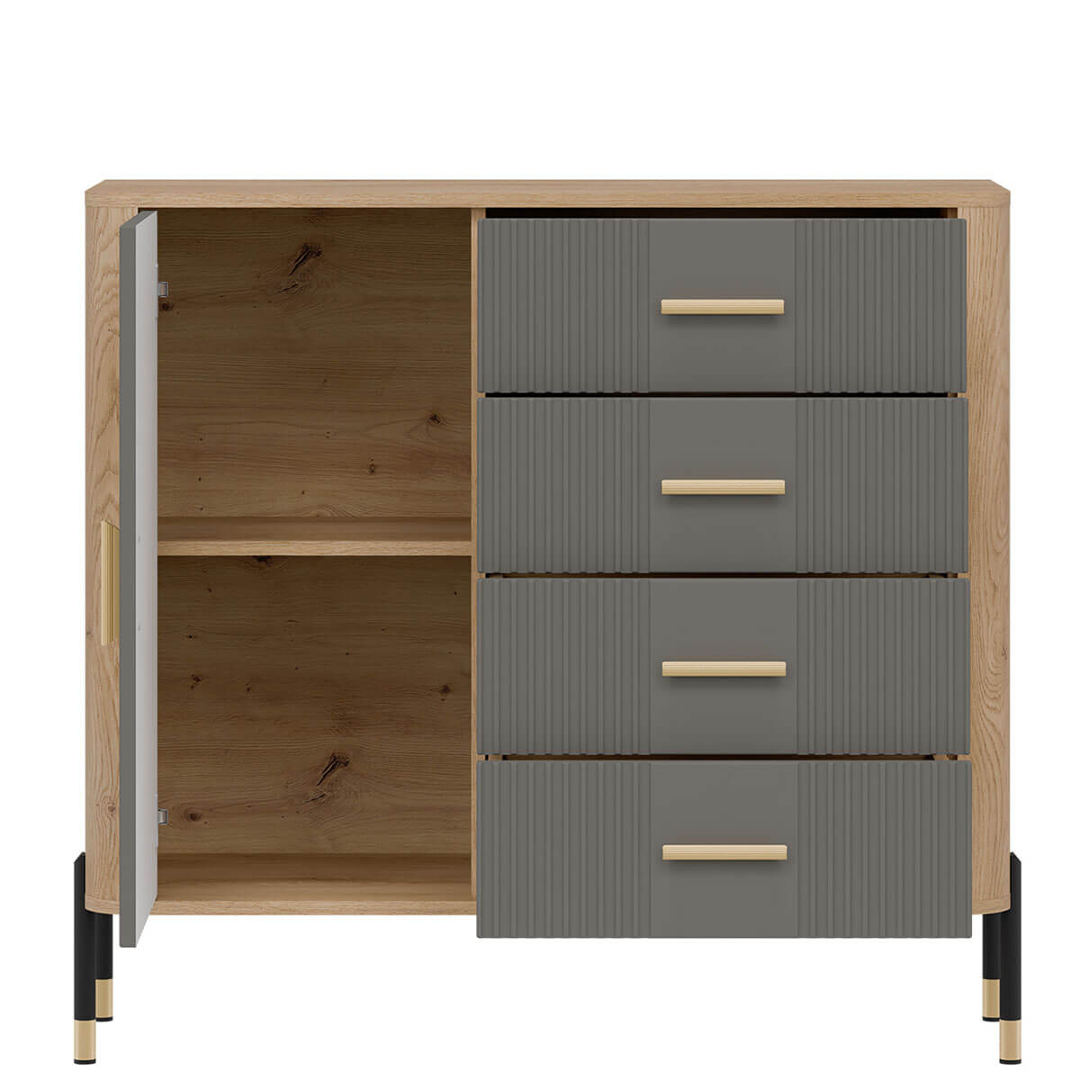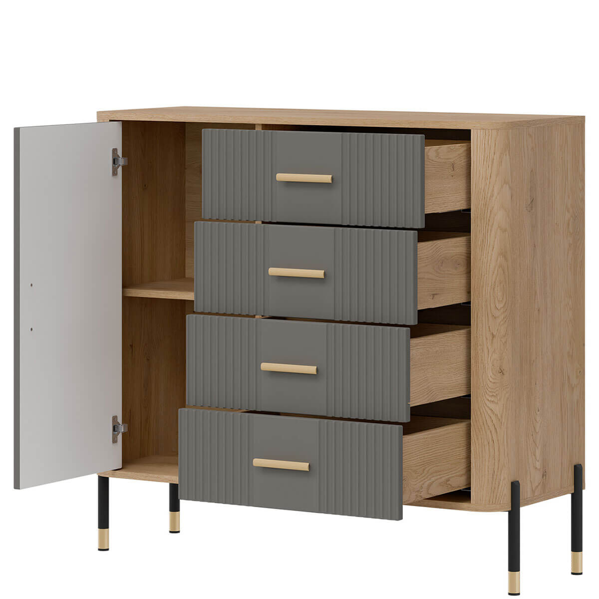 Комод Данте Лівео DT08 містить чотири шухляди та закрите відділення з полицею всередині.