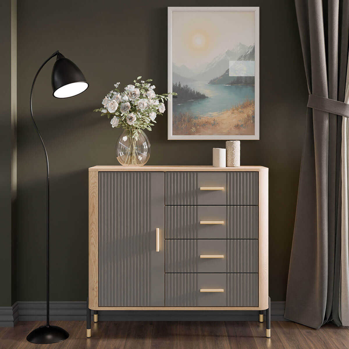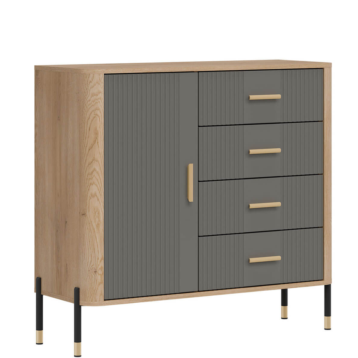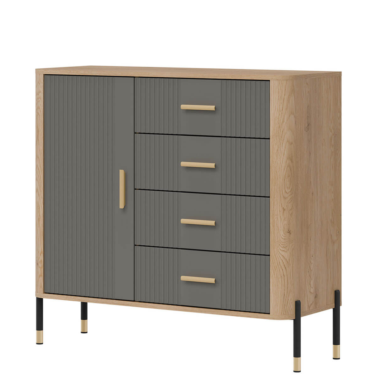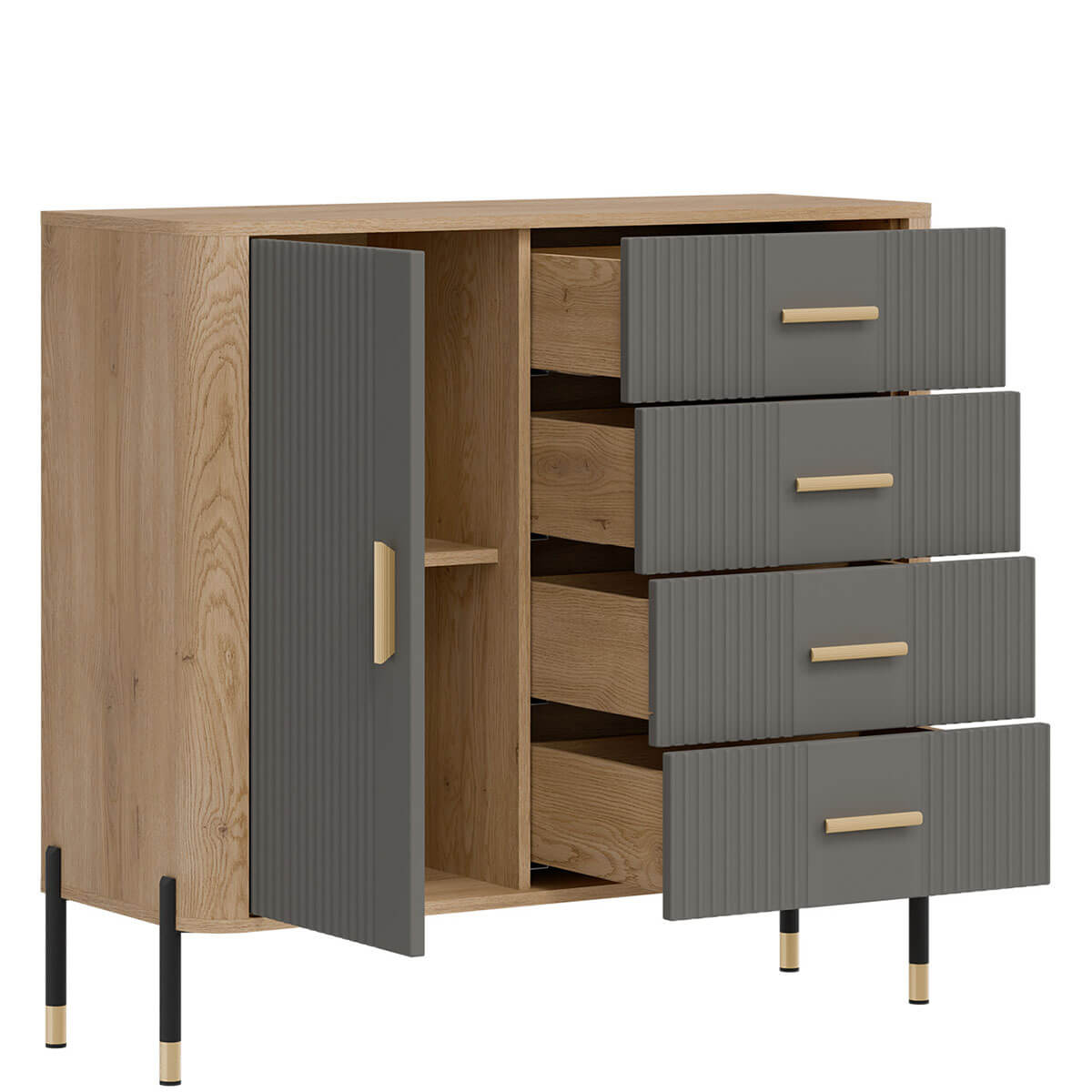 Комод Данте Лівео DT08 містить чотири шухляди та закрите відділення з полицею всередині.