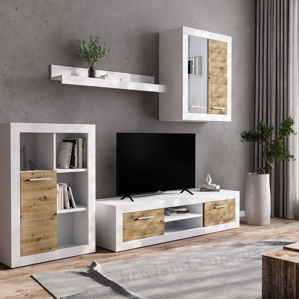 Стенка ШАКИРА БРВ нимфея альба / дуб артизан – мебельный комплект для гостиной со встроенной подсветкой.